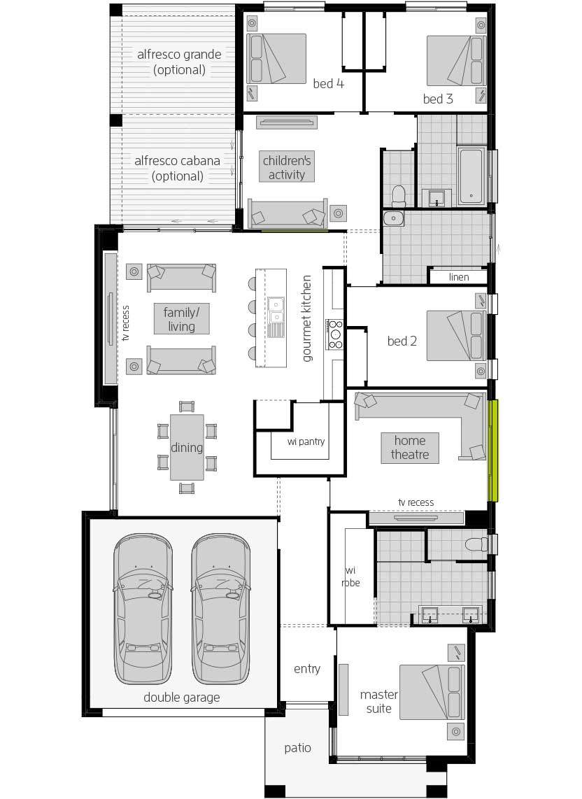 Family is number one in the Havana – and there’s plenty of scope for multi-functional use of space. A well-appointed gourmet kitchen overlooks the spacious dining and living zones, which flow generously to the airy alfresco cabana. There’s also a generous home theatre and separate children’s activity room to ensure oodles of social spaces and quiet areas of retreat.